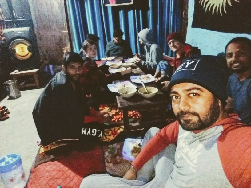 We had a simple, but satisfying lunch while warming ourselves at a fire in Rudranag. Then we came down, and it was easy and took less time than expected. With a (false) sense of accomplishment, we came back to the main road, looking forward to a short, leisurely stroll to the Cafe and a good rest. My shoulders were giving me hell.